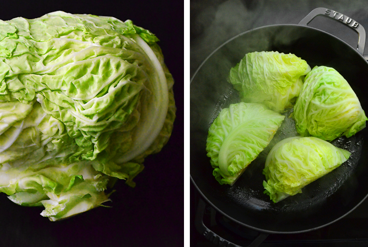 Cook the cabbage wedges briefly in plenty of salted boiling water, drain well, and toss with the melted butter; I like to take the additional step of browning each wedge with butter in a hot pan to add a bit of color and develop some of the sugars. Slice the meat and arrange it and the cabbage on a platter. To serve, reheat the sauce and pour it over.