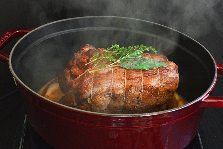 In a large saute pan set over medium-high heat, cook the onion and carrot with 1 tablespoon of olive oil for 10 to 12 minutes. Transfer to a heavy baking dish. Add the remaining 1 tablespoon of olive oil to the same saute pan and brown and sear the shoulder, turning frequently to give it a little color all over. This may take 10 to 15 minutes, depending on your stove. When the meat is browned, place it fat side up on top of the carrots and onions along with the garlic, rosemary, thyme, sage, and bay. Deglaze the saute pan with white wine, scraping the pan to loosen the browned bits. Add the liquid to the pot with the meat along with the chicken stock. Place in the oven and braise uncovered for 45 minutes before turning the meat over to cook for another 30 minutes. Check for the doneness by inserting a skewer into the meat – if it slides in easily, the meat is probably done. If you have a thermometer, the temperature should read no less than 145’F at the center. Cook the meat longer as needed and remove it from the oven when tender. Transfer the roast to a platter, skim the extra fat off the braising liquid and pass the liquid and vegetables through a strainer to make the sauce.
