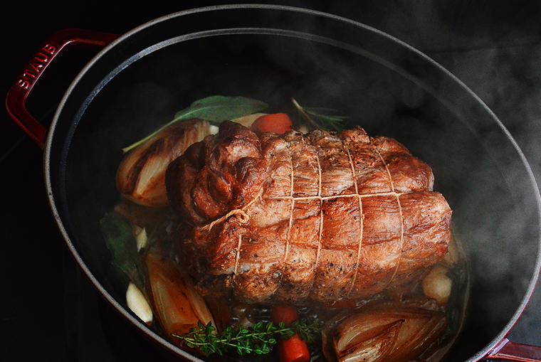 For my first recipe I chose to prepare Épaule de Porc Braisée aux Chou; Braised Pork Shoulder with Savoy Cabbage from the chapter titled Dans la Cuisine de Chez Panisse (In The Kitchen at Chez Panisse). As Chef Jean-Pierre says, “Braised meat is a comfort food I never grow tired of. I like the subtle flavors that the vegetables, herbs, and meat develop as they come together, bubbling quietly in the oven while slowly working their magic.” I found this dish full of comfort, especially in the midst of a record-setting February deep freeze.