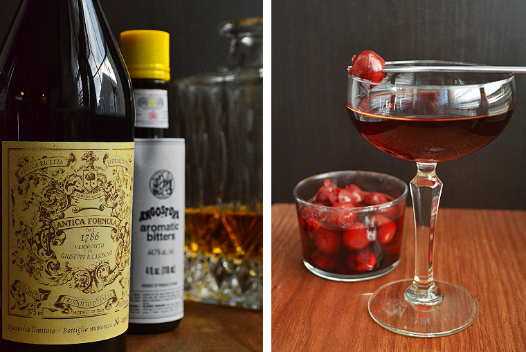 I’ve made a version with period-correct ingredients; Kentucky straight bourbon whiskey, Carpano Antica Formula vermouth, and I chose dark morello cherries instead of maraschinos for their tartness and to enhance the stone fruit and cherry notes in the vermouth.