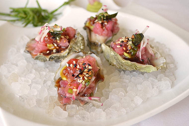 Deep Bay Oysters on the Half Shell, ahi tartare, wasabi avocado mousse, yuzu hoisin glaze, toasted sesame, jalapeno, sea beans paired with a Blanc de Blanc Sparkling Wine by Michigan’s own Larry Mawby (L.Mawby)