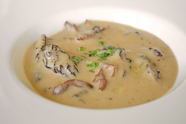 Morel Chanterelle Bisque, Chateau d’Orignac, cream, chive, truffle oil
