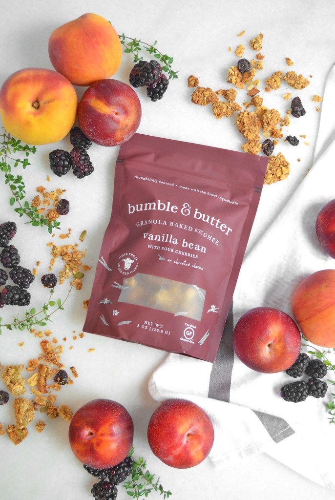 For this recipe, I chose Bumble and Butter’s Vanilla Bean with sour cherries granola to serve at brunch, but their range of flavors lends versatility to the recipe. Stay tuned for more dishes featuring Bumble & Butter!