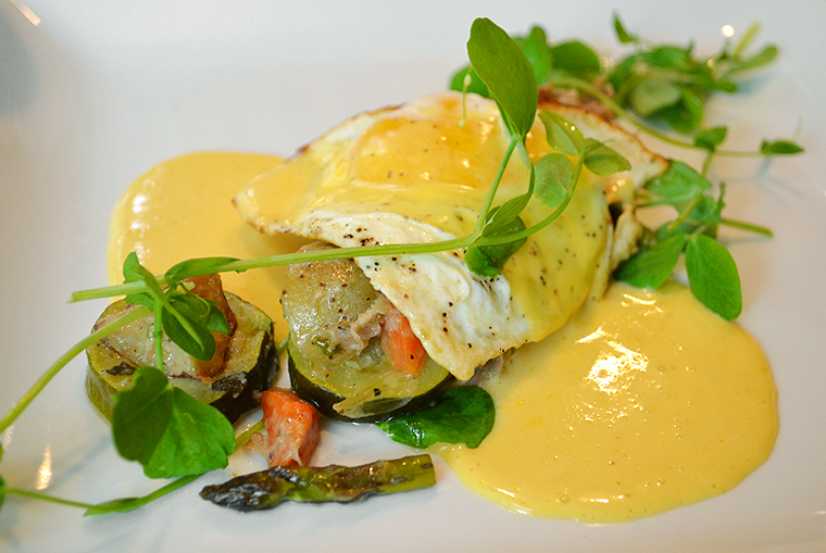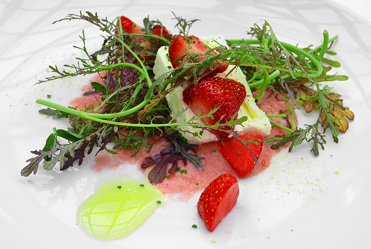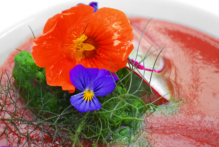 An intriguing molded chocolate sphere reminds me of a birds nest with two “eggs” of buttery ice cream in a pool of rich salted caramel; an edible flowerbed of incredibly moist and rich chocolate cake studded with caramel cream and ice cream topped with edible flowers and crunchy cocoa nibs. Each element was executed perfectly and the result is a stunning plate that truly tastes as good as it looks.